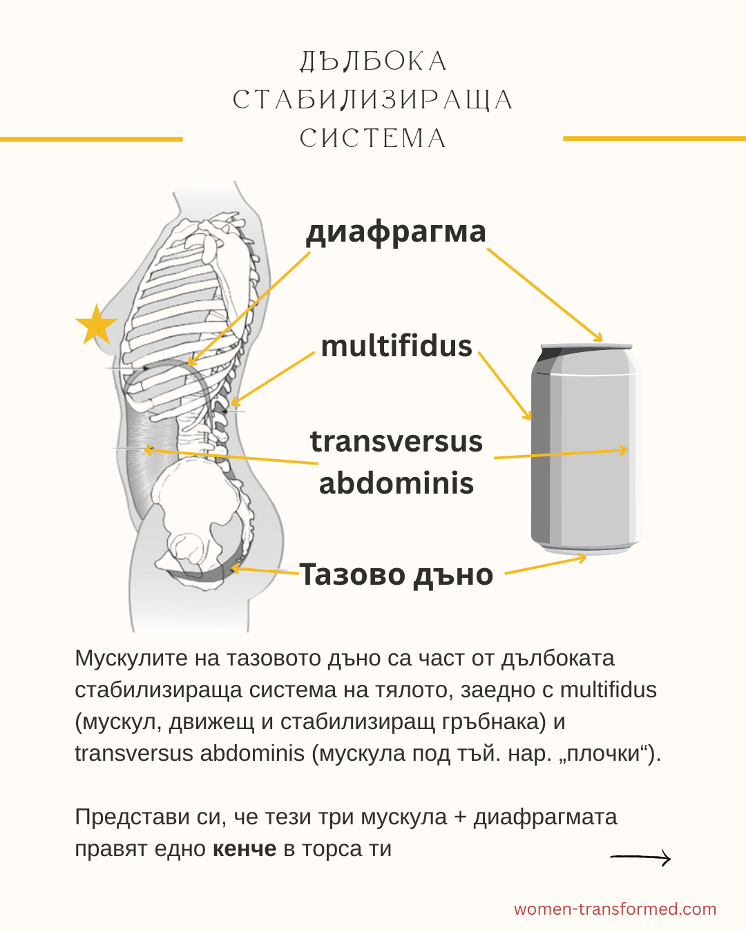 Мускулите на тазовото дъно са част от дълбоката стабилизираща система на тялото, заедно с multifidus (мускул, стабилизиращ гръбнака) и transversus abdominis (мускула под тъй. нар. „плочки“). Представи си, че тези три мускула + диафрагмата правят едно кенче в торса ти – тазовото дъно е... дъното на кенчето, диафрагмата е горната му част, а multifidus и transversus abdominis са страните на кенчето. Цялото кенче работи в унисон и се грижи за напрежението в коремната ти кухина. И трите мускула от дълбоката стабилизираща система се „включват“ по време на всяко движение от ежедневието ни – т.е. дори вдигането на ръка активира тазовото дъно, колкото и далеч да са едно от друго.